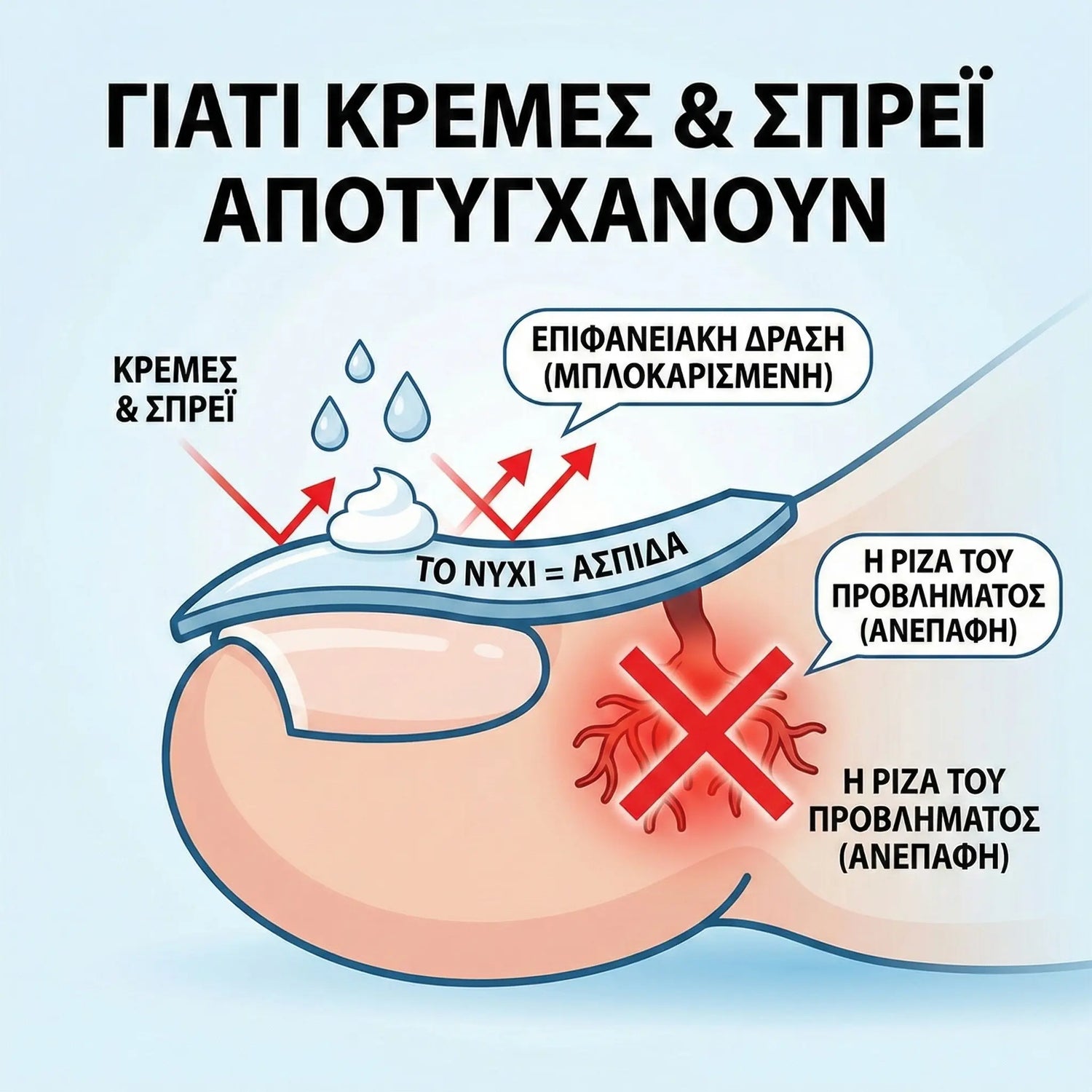 🍄 Η Ρίζα μένει Ανέπαφη: Ο μύκητας ζει ασφαλής κάτω από το νύχι. Εφόσον η θεραπεία δεν τον αγγίζει, συνεχίζει να αναπτύσσεται.